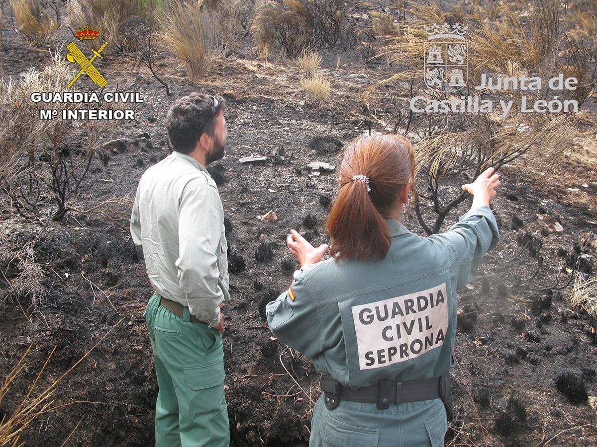 Componentes del Equipo de SEPRONA Guardia Civil de León han instruido diligencias en las que ha resultado investigado una persona como presunta autora de un incendio forestal en terrenos próximos a la localidad de Villaquejida (León) el pasado 19 de julio de este año.
