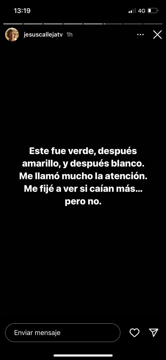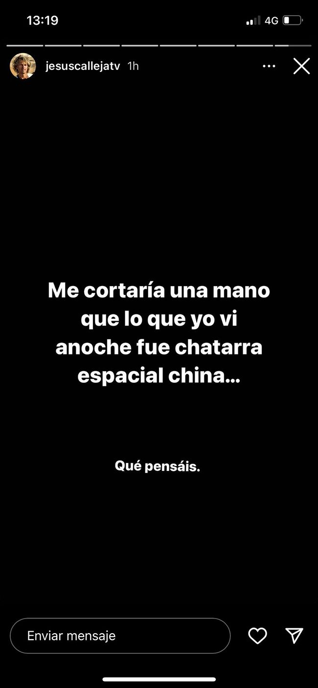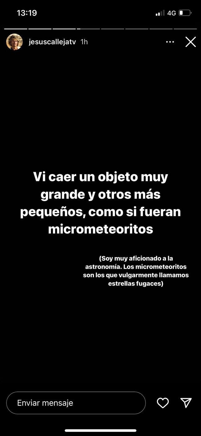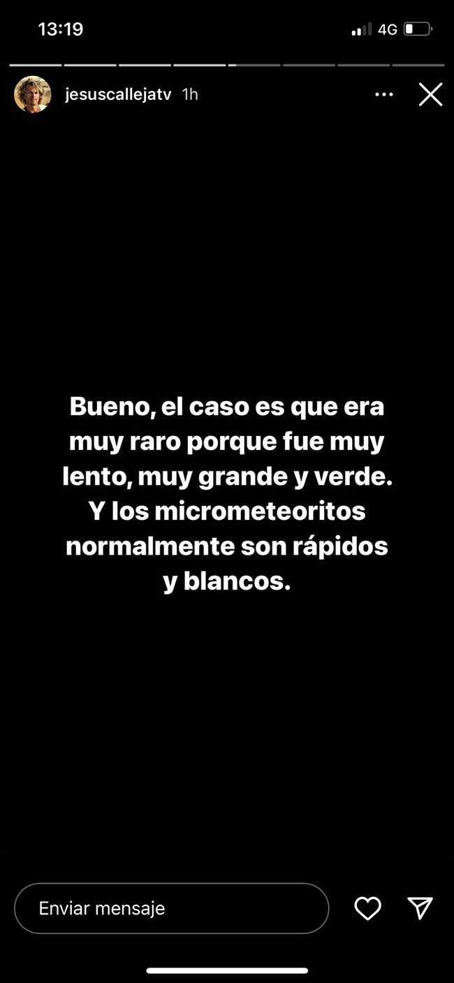"El caso es que era muy raro porque fue muy lento, muy grande y verde. Y los micrometeoritos son rápidos y blancos. Este fue verde, después amarillo, y después blanco. Me llamó mucho la atención. Me fijé a ver si caían más... pero no", apunta el leonés en los stories de su Instagram @jesuscallejatv. Una vez que Calleja expone lo que pudo ver la pasada noche, añade otro storie en el que muestra una de las noticias de la caída sin control de un cohete chino que ha obligado a cerrar el espacio aéreo de varios aeropuertos españoles, a lo que añade "¡Y hoy me levanto con esta noticia!".