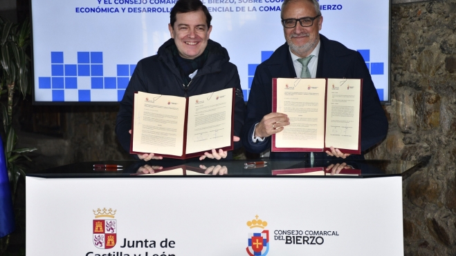 El presidente de la Junta de Castilla y León, Alfonso Fernández Mañueco, y el presidente del Consejo Comarcal del Bierzo, Olegario Ramón, firmaron este lunes en San Miguel de las Dueñas (Congosto) el nuevo convenio marco de colaboración institucional, un acuerdo que renueva y amplía el suscrito y estará vigente hasta 2029.