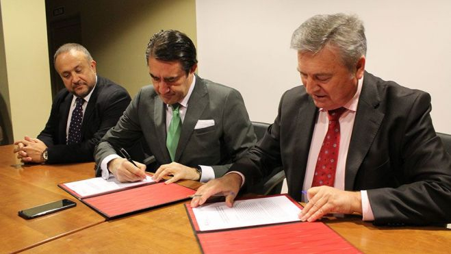 avispilla635 El presidente del Consejo Comarcal, Gerardo Álvarez (I), el consejero de Fomento y Medio Ambiente, Juan Carlos Suárez-Quiñones y el alcalde de Carracedelo y diputado provincial, Raúl Valcarce (D), durante la firma del convenio
