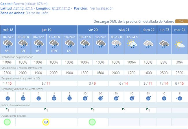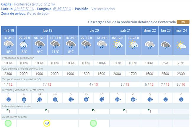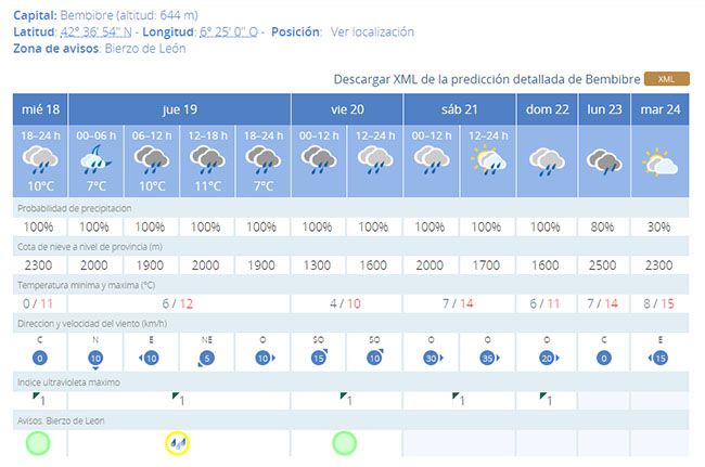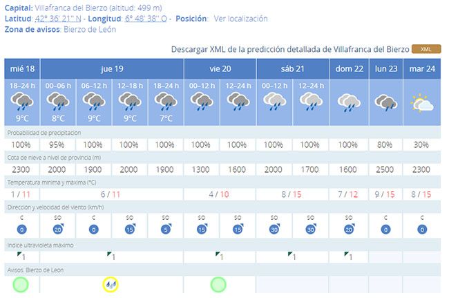 alerta amarilla por riesgo de fuertes lluvias en toda la Comarca del Bierzo y la alerta naranja por vientos en algunos municipios. Las precipitaciones comenzarán a caer con más fuerza a partir de las 12.00 del mediodía de este jueves hasta las 00.00 de la noche, hora en la que la alerta finaliza. Las temperaturas mínimas rondarán los 7 grados y las máximas alcanzarán los 12 grados centígrados. En algunos municipios como Páramo del Sil la Aemet ha activado la alerta naranja por riesgo de vientos de hasta 100 kilómetros por hora.