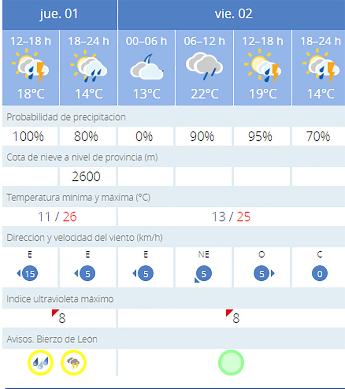 En Fabero la situación será similar a la de la capital berciana, el aviso amarillo por tormentas y lluvia permanecerá a lo largo del jueves acompañado de temperaturas entre los 10 y 26 grados. La jornada del viernes no se mantendrá la alerta, pese a que también existe posibilidad de tormentas.