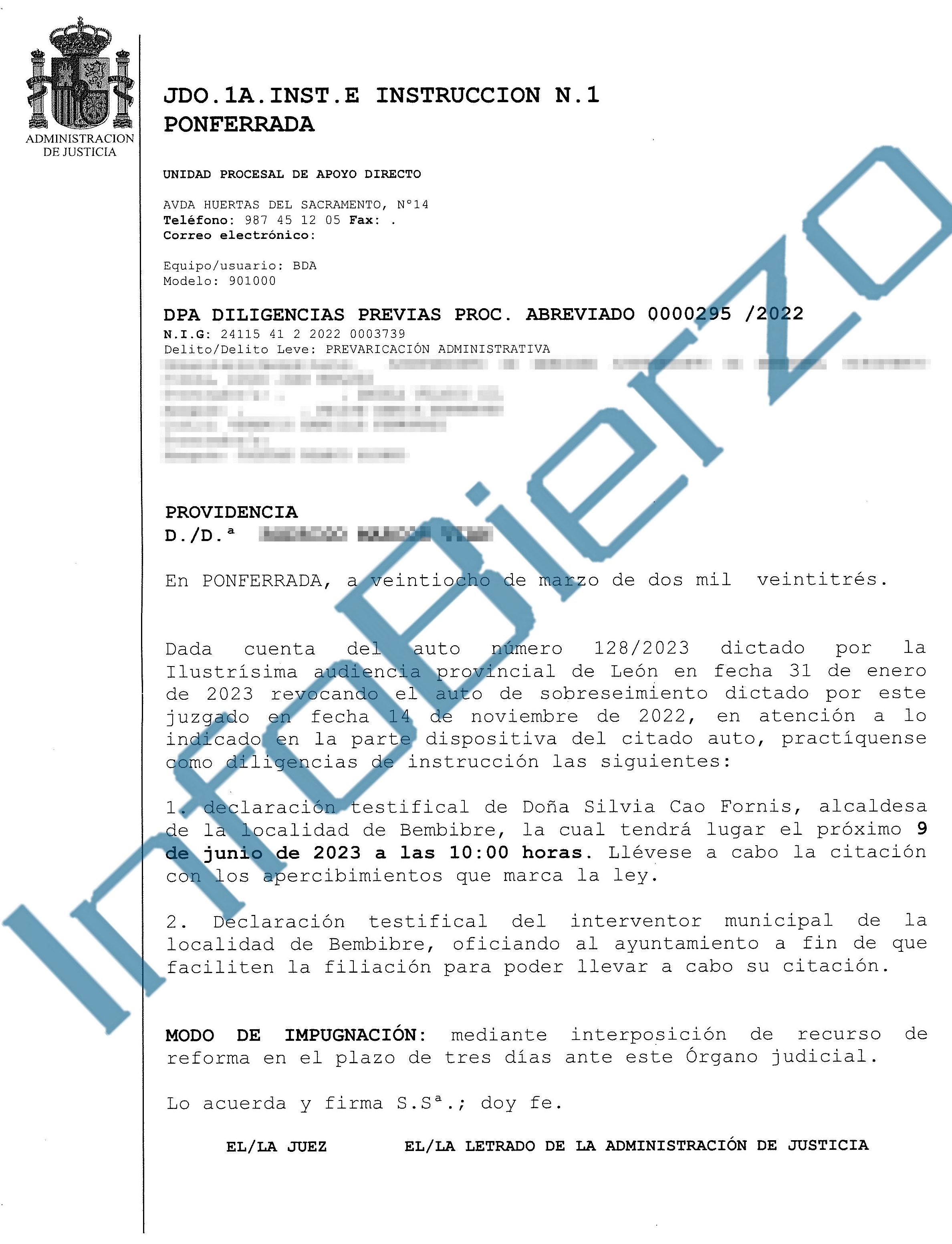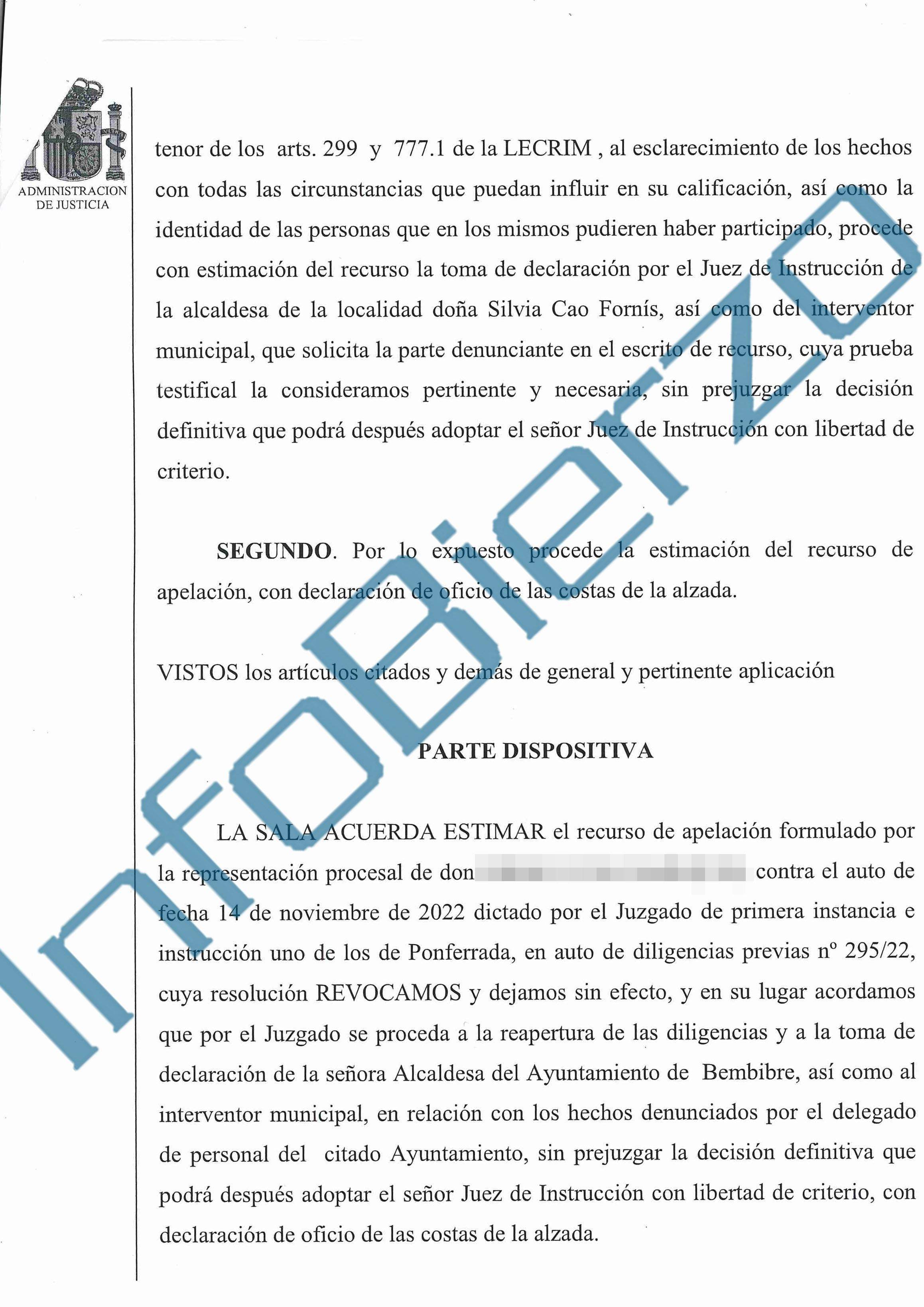 Este sobreseimiento es recurrido ante la Audiencia Provincial de León, cuyos 3 magistrados, por unanimidad, deciden revocar y dejar sin efecto el auto previo y reabrir el caso. Entre los motivos que apelan para tomar esta decisión, instan al Juzgado de Ponferrada que investigar sobre lo denunciado. Tal y como aparece en la resolución, "el no haberse llevado a cabo por el Juzgado determinadas diligencias que considera necesarias y de interés para el esclarecimiento de los hechos". Así, Cao está llamada a declarar el 9 de junio en los Juzgados de Ponferrada.
