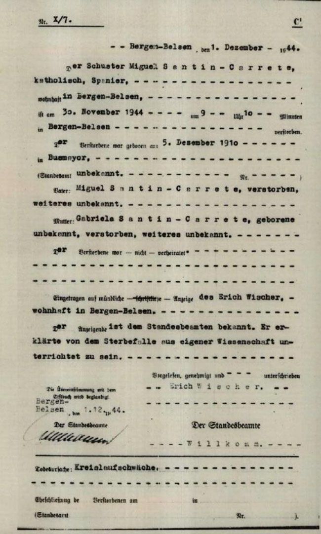 Nacido el 5 de diciembre de 1910 en Busmayor – Barjas (León), hijo de Miguel y Gabriela. Exiliado a Francia, deportado a Berger-Belsen. Según datos aportados por el archivo del campo de concentración de Berger-Belsen, Miguel fue trasladado de Compiegne a Neuengamme el 21 de mayo de 1944. Durante el verano y el otoño de 1944 la SS envió tres transportes de Neuengamme a Bergen-Belsen con unos cientos de hombres enfermos. Muchos de ellos, como podría ser el caso de Miguel Carrete, murieron allí y fueron enterrados en fosas comunes en el mismo campo. Su fallecimiento está fechado el 30/11/1944.