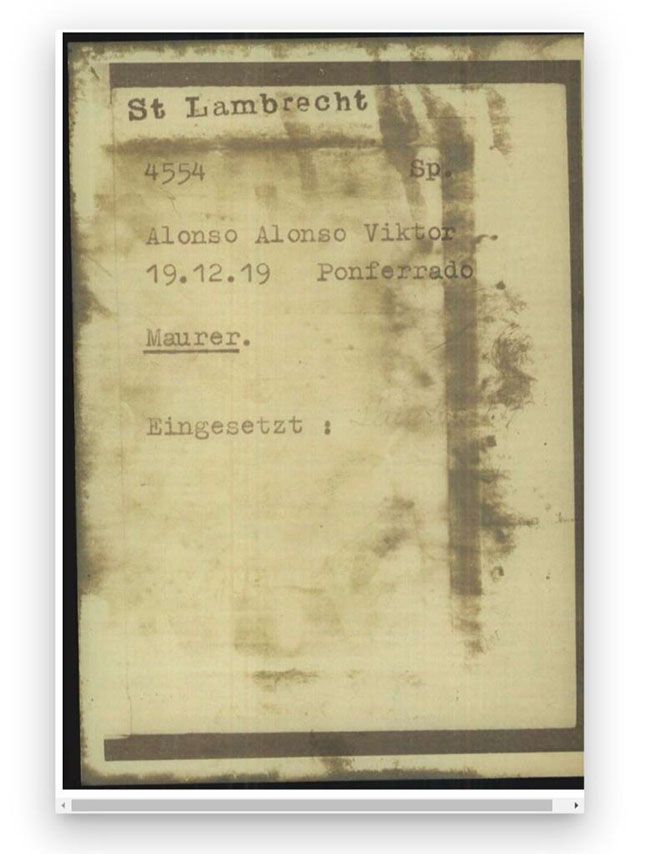 Nació el 19 de diciembre de 1919 en Castrillo de Cabrera (León). Soltero y de profesión campesino. Exiliado a Francia, detenido en el Stalag V-D Estrasburgo y deportado el 13 de diciembre de 1940 a Mauthausen. Con número de prisionero 4554, finalmente fue trasladado el 2 de julio de 1943 a Sankt Lambrecht. Una abadía benedictina que funcionaba como subcampo de Mauthausen. Es trasladado junto a otros 98 españoles que realizaban trabajos especializados en los bosques de la zona y en albañilería. El subcampo de Sankt Lambrecht no fue evacuado y parece posible que se quedaran sin guardias durante los últimos días. Finalmente, el 11 de mayo fueron liberados por tropas británicas. Víctor Alonso falleció en Saint-Quentin (Francia) en 2006.
