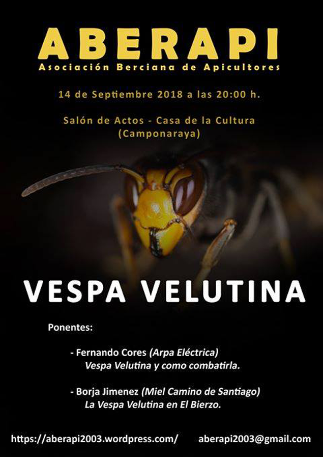 Desde ABERAPI, recuerdan que este próximo viernes 14 de Septiembre a las 20:00 en el Salón de Actos de la Casa de la Cultura de Camponaraya ofrecerán una jornada divulgativa sobre la Avispa Asiática, abierta a todo el público. En ella los expertos Fernando Fernando Cores y Borja Jiménez explicarán todo lo necesario para distinguirla de la europea, métodos de trampeo, manejos de colmenares, etc.
