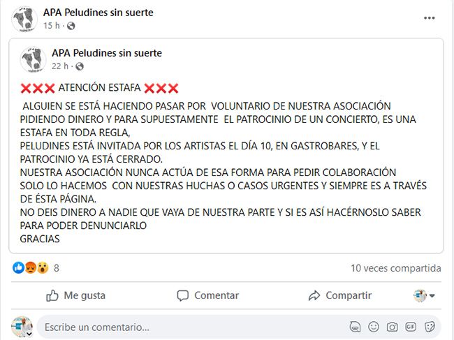 Desde Peludines Sin Suerte, constatan que la protectora "hace recaudaciones, pero sólo en la página de Peludines Sin Suerte o a través de huchas con el logotipo colocadas en establecimientos concertados" añadiendo que "denunciamos esto para que no caiga más gente".