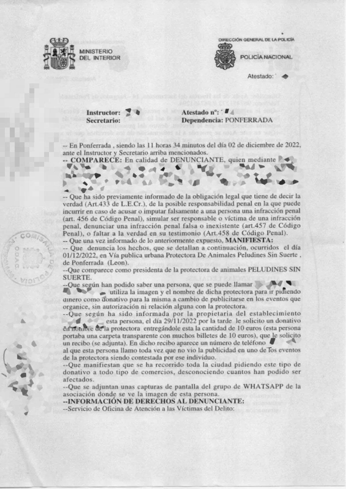 La Asociación Protectora de Animales Peludines Sin Suerte ha sido víctima de una "estafa", tal y como explica Jael Ramos, tesorera de la APA. Una situación que ya ha sido denunciada ante la Policía Nacional durante la mañana de este viernes, y que responde a una presunta estafa por suplantar la identidad de la asociación, por parte de un hombre en Ponferrada. El denunciado "se hacía pasar por Peludines Sin Suerte y recorría por los establecimientos buscando patrocinio para un evento que habrá en los gastrobares. El dinero que le daban, evidentemente, no llegaba a Peludines Sin Suerte", apunta Ramos a InfoBierzo.