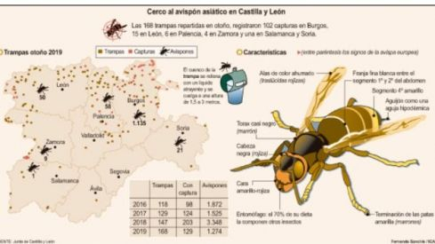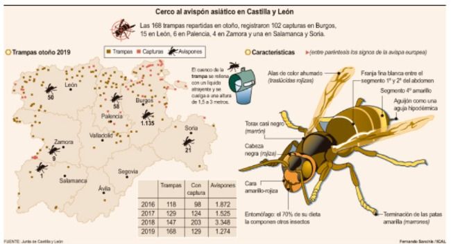 Aunque la presencia de la avispa asiática sigue haciendo de las suyas tanto en Castilla y León como en El Bierzo, en este último la plaga descendió y las capturas se duplicaron el pasado otoño de 2019 con respecto al otoño de 2018. En cuanto a la Comunidad, el primer caso se detectó en 2014 en Burgos donde actualmente la plaga está más activa. Le sigue la Comarca del Bierzo y Picos de Europa (León), al tiempo que se ha detectado en los últimos meses en zonas de la meseta de Palencia, Soria y en los Arribes del Duero.