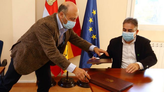 El presidente de la Confederación Hidrográfica Miño-Sil (CHMS), José Antonio Quiroga (I), junto al presidente de Asprona Bierzo, Valentín Barrio (D), durante la firma del convenio de colaboración que facilitará la inserción de personas con discapacidad intelectual a través de prácticas formativas en las oficinas de la CHMS en Ponferrada (Fotos: César Sánchez / ICAL)El presidente de la Confederación Hidrográfica Miño-Sil (CHMS), José Antonio Quiroga, y el director general de Asprona Bierzo, Valentín Barrio, firmaron este jueves el convenio de colaboración que permitirá que dos personas con discapacidad intelectual, socias de la entidad, desarrollen sus prácticas formativas en ámbitos como la administración o los archivos, en las oficinas de la CHMS en Ponferrada. Barrio valoró esta colaboración como una forma de “abrir nuevas vías de integración laboral” para un colectivo cuya imagen se asocia tradicionalmente al trabajo manual y artesanal