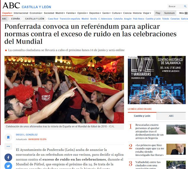 "Ponferrada convoca un referéndum para aplicar normas contra el exceso de ruido en las celebraciones del Mundial", titula Abc. La web de Practico Deporte, el diario online de Deporte de la Agencia Efe, opta por una fórmula más sintética: "Referéndum en Ponferrada: mesura o euforia durante el Mundial de Fútbol".
