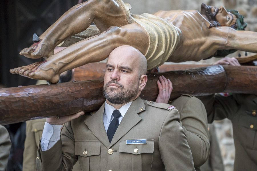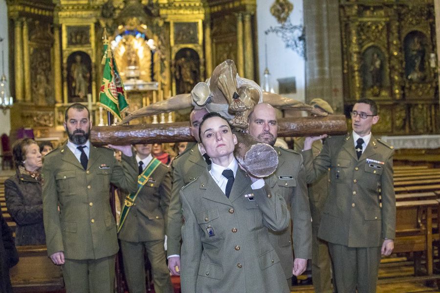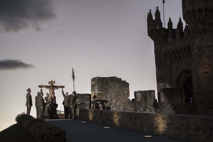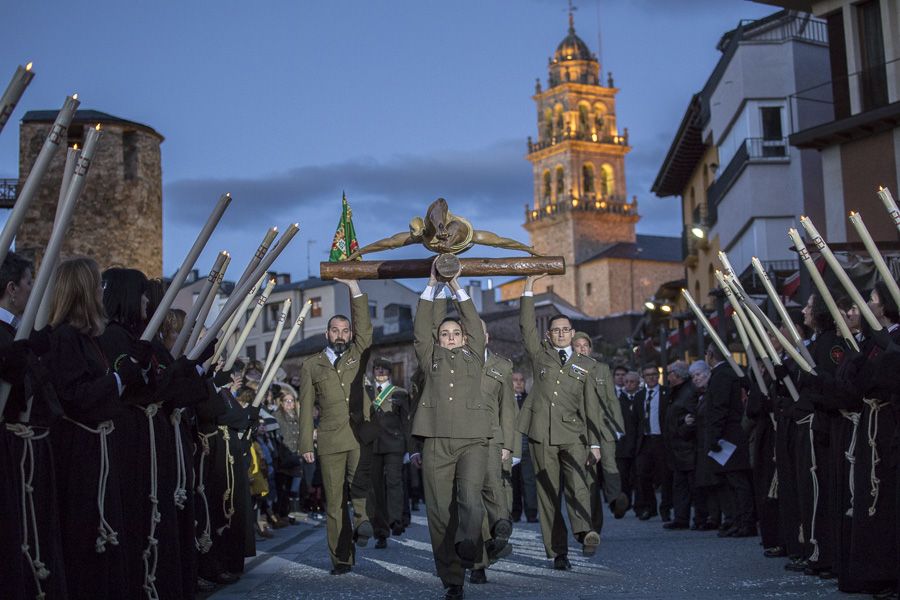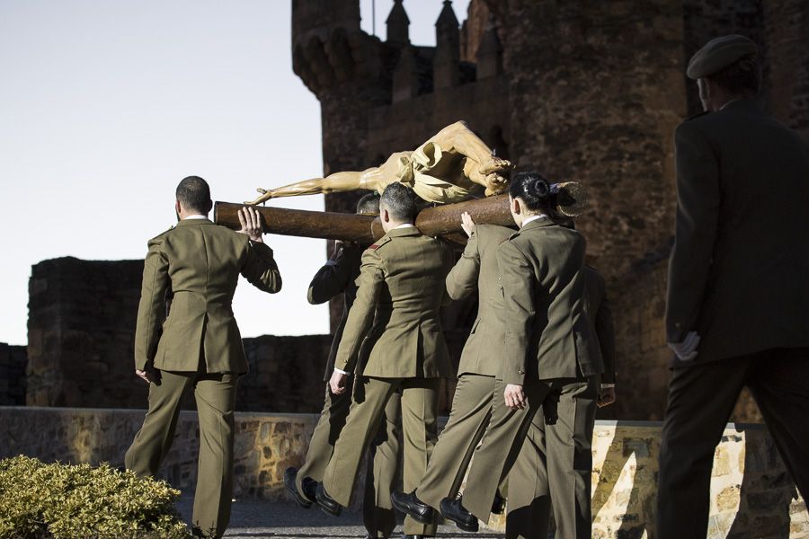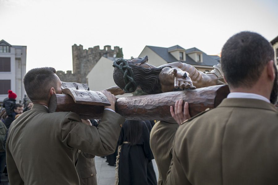 Ponferrada cerró su Domingo de Ramos con la celebración por tercer año consecutivo del Traslado al Castillo y Entronización del Cristo de la Esperanza, que corre a cargo de componentes de la USAC (Unidad de Servicios del Acuartelamiento) Santocildes del Ejército de Tierra de Astorga.
