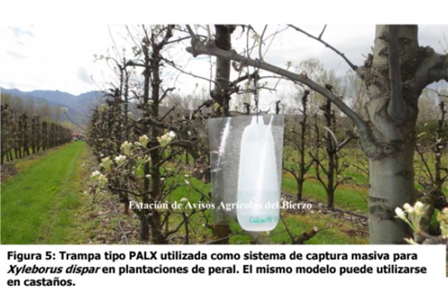 Pueden utilizarse trampas cebadas con alcohol, que deben colocarse antes del inicio del período de vuelo de dispersión que comienza cuando las temperaturas diurnas comienzan a alcanzar los 20 grados, aproximadamente en febrero o principios de marzo en función de la meteorología. Este sistema es apto para perales y castaños.