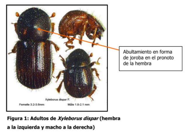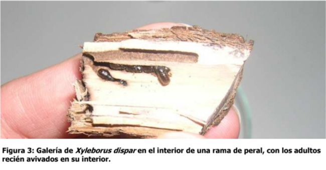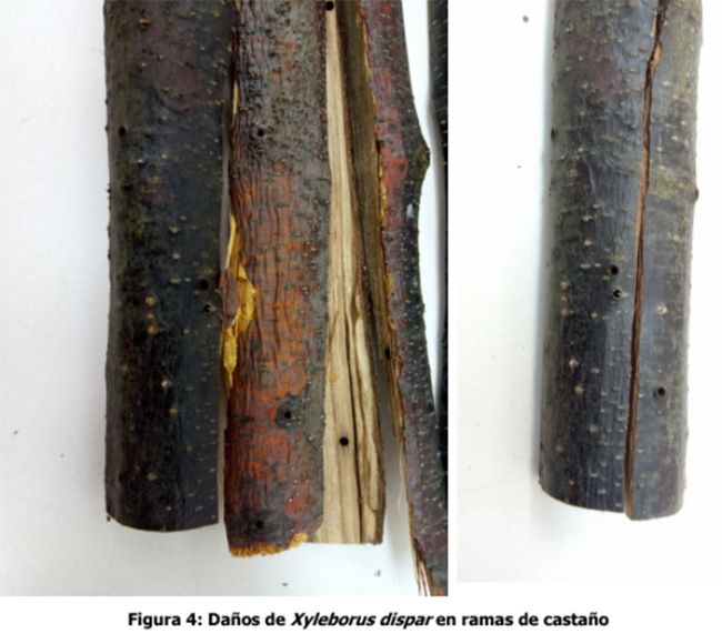 El insecto barrenador de la madera, Xyleborus dispar, produce daños en plantaciones de peral y castaño que pueden confundirse con ataques de Fuego bacteriano, ya que generan pudriciones de la madera y necrosis de las ramas atacadas. "En principio las hojas marchitas permanecen sobre las ramas afectadas, dando apariencia de ataque de Fuego bacteriano. En ataques más antiguos, las hojas finalmente caen y la madera queda totalmente ennegrecida", avisan desde el Servicio Territorial de Agricultura, Ganadería y Desarrollo Rural.