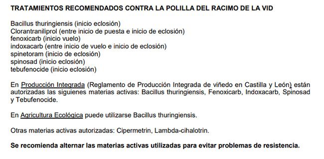 "Esta semana estamos en el momento de máximo vuelo de los adultos de segunda generación de esta plaga, salvo en el municipio de Toral de los Vados, donde ya pasó el momento de máximo vuelo pero la cantidad de plaga aún está alta", explican. Por tanto, recomiendam realizar algún tratamiento contra esta plaga en el viñedo. "En esta semana lo más eficaz será aplicar materias activas de las recomendadas al inicio de eclosión de los huevos de polilla", aseguran desde la Estación de Avisos.