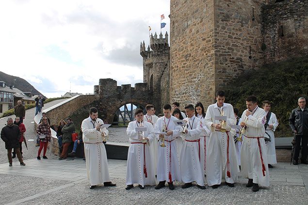 El Lambrión, vestido de negro y con el rostro cubierto por un capirote, con una soga a la cintura y la medalla de su Cofradía, ha salido este sábado seguido de un grupo de niños de la Basílica de la Encina para anunciar con el tañido de una campana la proximidad de las celebraciones de la Pasión por las calles de Ponferrada.