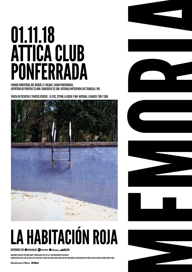 La Habitación Roja actuará el próximo 1 de noviembre en Attica Club Ponferrada, dentro de su gira de presentación de 'Memoria', su último disco. El concierto comenzará a las 22.30 horas; la apertura de puertas a las 22.00 horas.