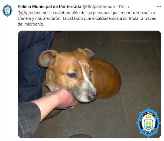 La Policía de Ponferrada ha encontrado en la tarde de este martes a Canela, un perro perdido en la localidad ponferradina gracias a la colaboración de los ciudadanos. Así lo han explicado en las redes sociales: "Agradecemos la