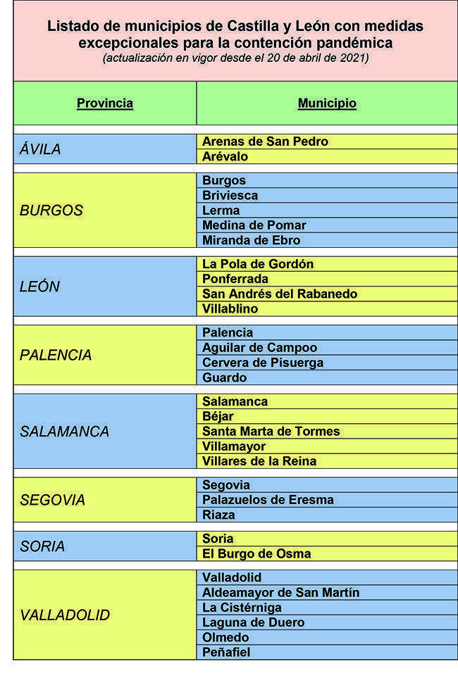 La Junta de Castilla y León acordó este lunes el cierre del interior de la hostelería en otras seis localidades por superar los 150 casos de incidencia acumulada en 14 días lo que eleva las restricciones excepcionales a 31 municipios, tras salir de esa situación cinco. Desde mañana cerrarán el interior de bares y casas de apuestas los municipios de Laguna de Duero, Ponferrada, Peñafiel, Guardo, Arévalo y Olmedo, mientras que podrán abrir en Tudela de Duero, Carbajosa de la Sagrada, Villamuriel de Cerrato y Venta de Baños.