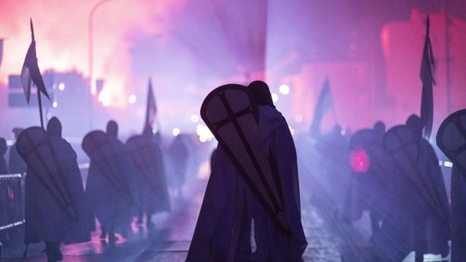 El Arca de la Alianza y el Santo Grial volvieron al Castillo de Ponferrada este sábado en el punto culminante de una nueva edición de la Noche Templaria. El desfile no pudo partir por la lluvia del paseo del río como es habitual. Sí hizo el recorrido por la Avenida del Castillo a través del Puente García Ojeda hasta la fortaleza, donde ya reposan las reliquias.