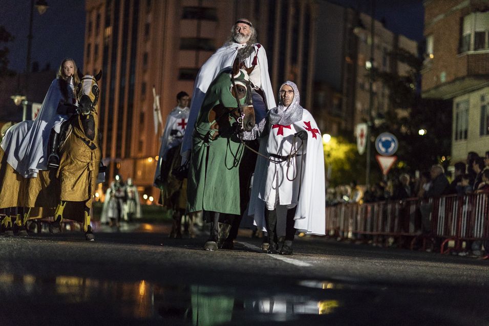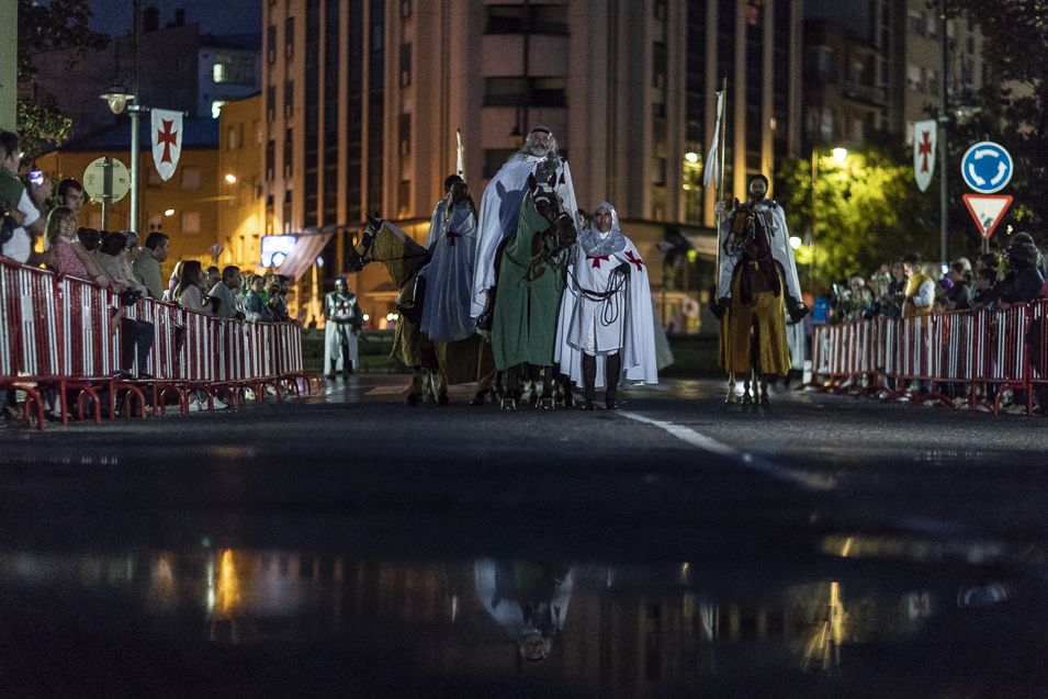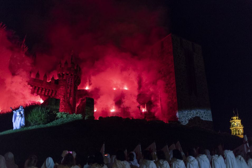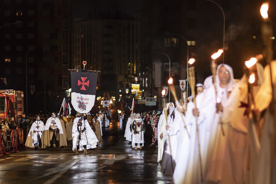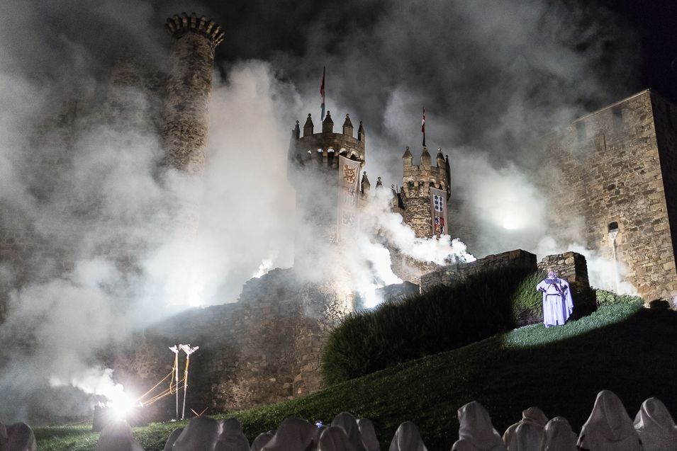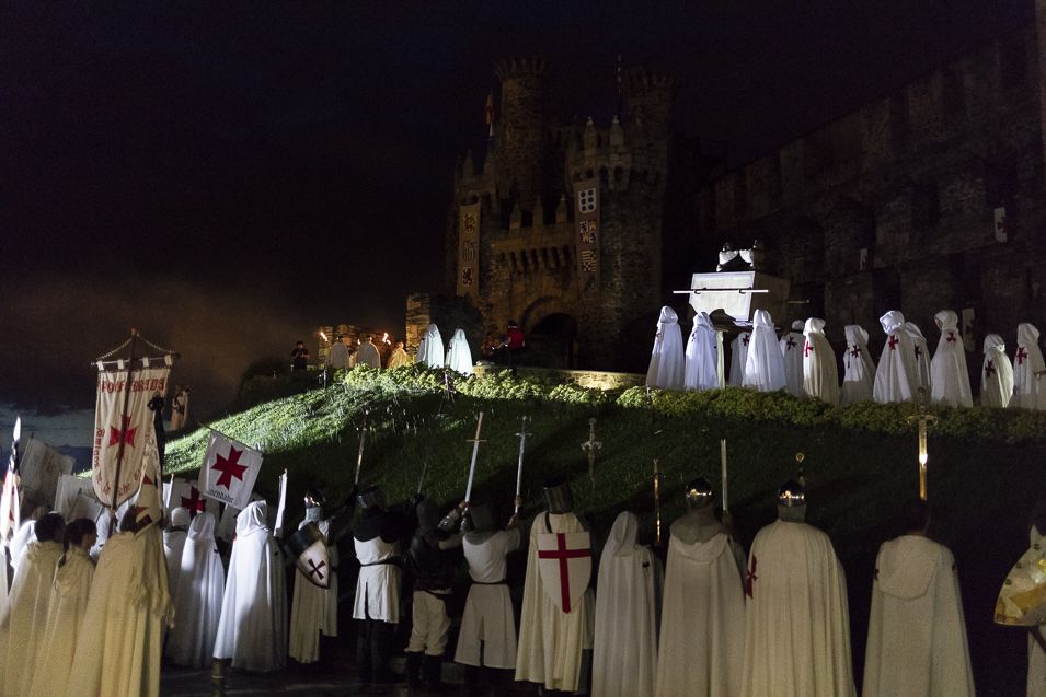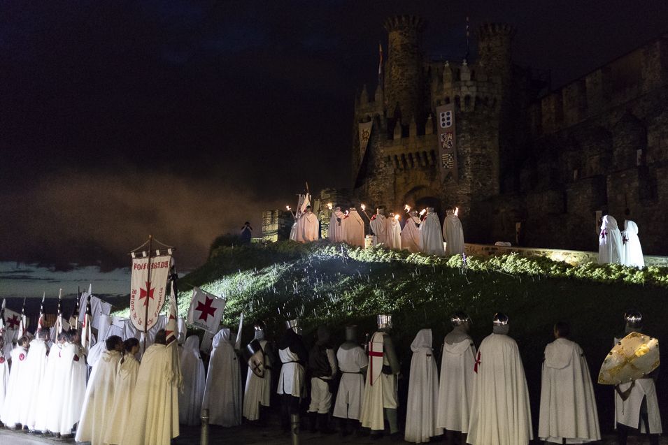 Guido da Garda llevó la guía del acto, ambientado con efectos pirotécnicos y con la actuación en directo de la Banda de Música Ciudad de Ponferrada. Las asociaciones de recreación templaria y las personas ataviadas de época participan en el desfile.