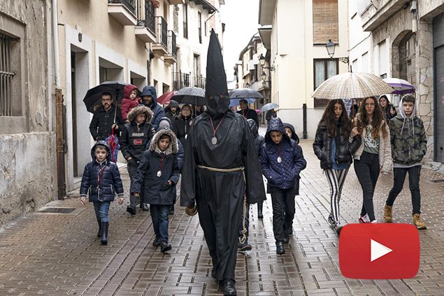Vestido completamente de negro, con el rostro cubierto por el capirote, una soga de esparto a la cintura y una campana en la mano, el Lambrión Chupacandiles ha salido el sábado previo al Viernes de Dolores de la Basílica de La Encina para recorrer las calles ponferradinas rodeado de niños.