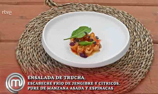 El entrante del menú de la prueba de exteriores consistió en un ensalada de trucha, escabeche frío de jengibre y cítricos, puré de manzana reineta del Bierzo asada y espinacas.