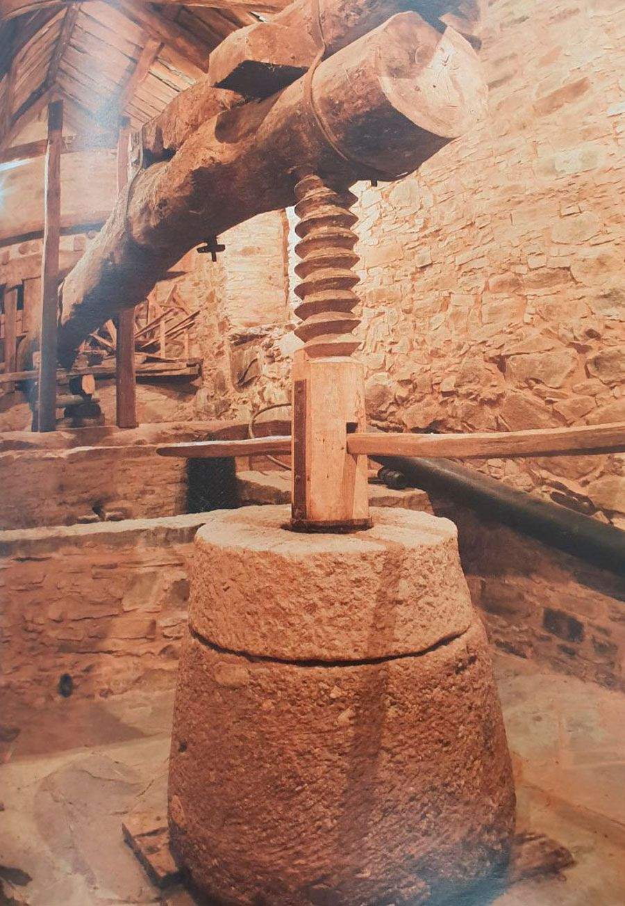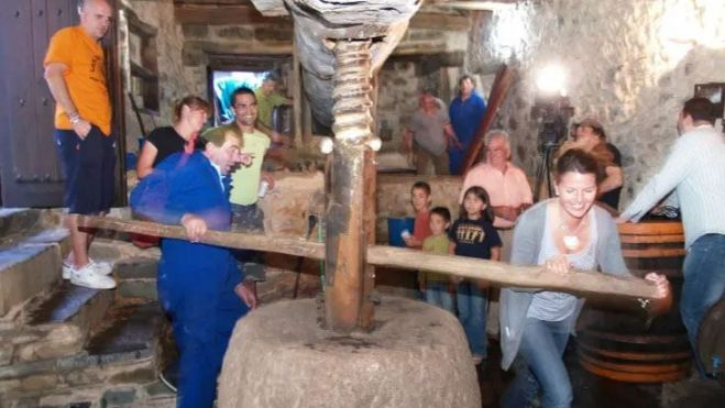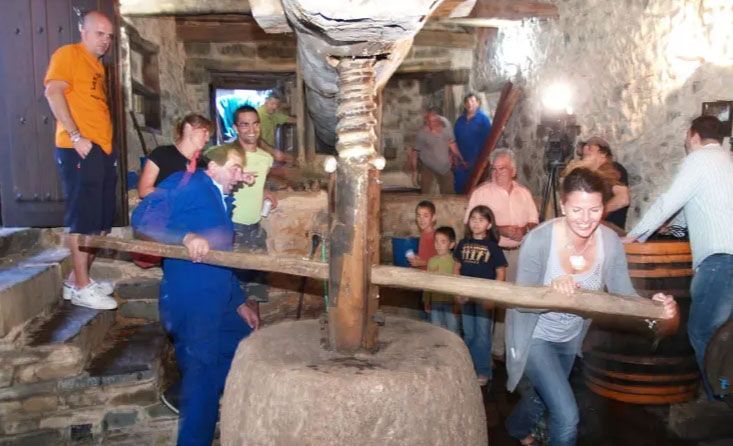 Cuando las uvas ya estaban en su punto de maduración en las cepas y arrancaba la vendimia, llegaba el momento de despertar y ponerse el movimiento. Unos días de intensa actividad después de en un largo letargo, prácticamente de septiembre a septiembre. La gran viga de madera abrazaba al huso, que de nuevo bailaba y bailaba, girando sobre sí mismo, con su enorme pedestal de piedra. La femia y las velas le seguían el compás, con ese ritmo lento de “prensado” con el que se va estrujando cada racimo, rompiendo cada uva, para extraer al máximo el mosto que días después será vino.