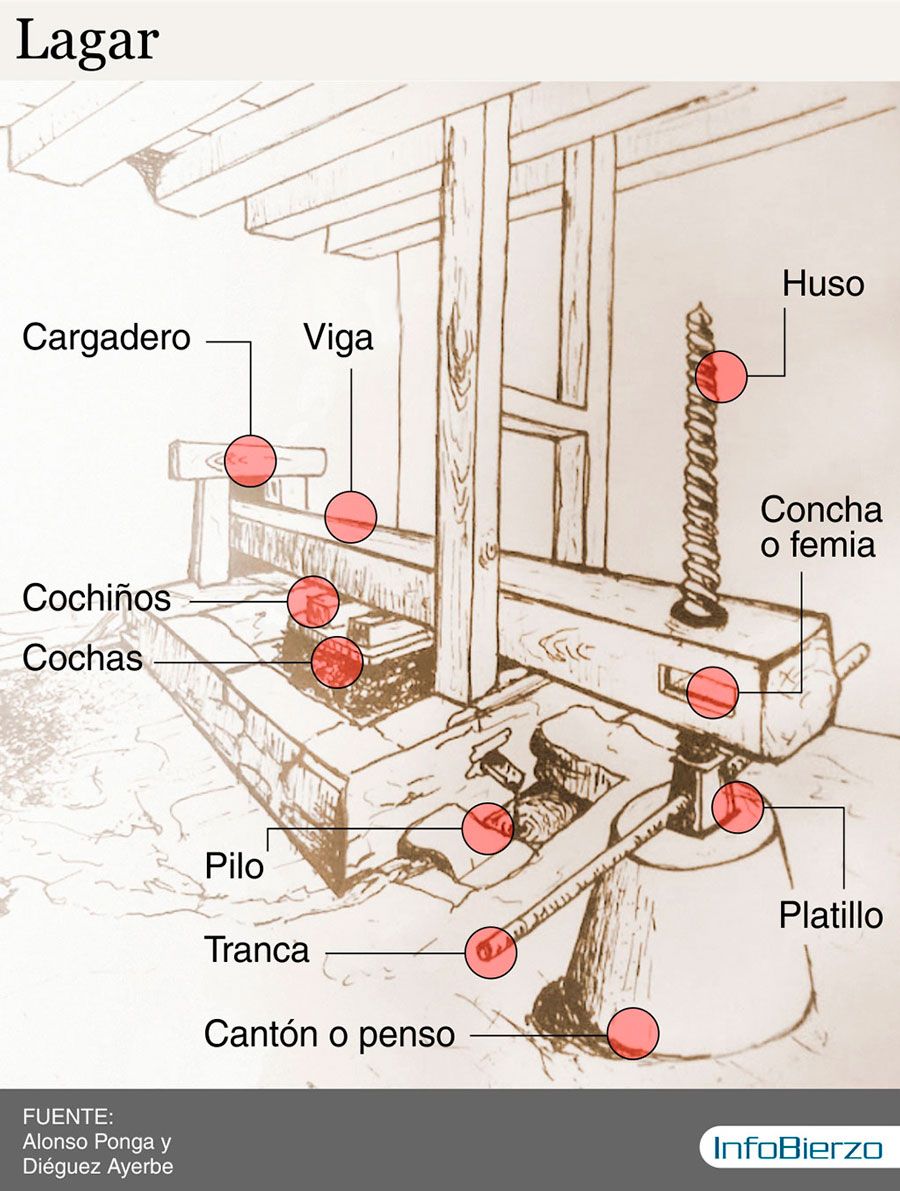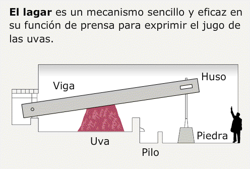 Así, el pie de uvas y la viga forman “una especie de balancín por el cual, cuando uno sube por un lado de la viga el otro baja, y viceversa”, explica Algorri. Con ese principio mecánico, el lagar se convierte en una herramienta muy útil para el “prensado masivo”. Años atrás, después de recoger las uvas se iba al lagar, introduciéndolas desde el carro –a través de los postigos o ventanas existentes- en la lagareta o directamente en el estanque de prensado. Entonces se hacía el pie, haciendo un montón con las uvas y colocando sobre él varios niveles de tablillas y cuarterones de madera (cochos o cochiños) para calzar la viga. A continuación dos personas hacían girar el huso tirando de la tranca, mientras la viga iba bajando lentamente y presionando los cochos de madera, estrujando los racimos que están debajo.