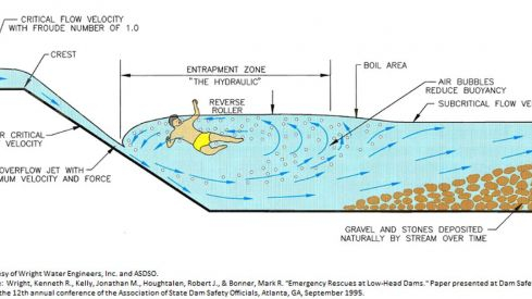 Las presas bajas forman en su base, explica didácticamente Aepira, lo que los piragüistas llaman un "rebufo", o, técnicamente, un resalto hidráulico, en el que el agua recircula hacia aguas arriba. La explicación de que sean una trampa mortal radica en que "en este tipo de presas la extensión y uniformidad de este rebufo, unido a la desorientación provocada por la turbulencia, la hipotermia, los golpes que puedan recibirse y la incapacidad de escapar de ellas nadando en superficie se combinan para crear una trampa mortal, incluso para buenos nadadores, aunque estén equipados con chaleco de flotación". La simetría del diseño de estas presas hace que el rebufo no se rompa por ningún lado, impidiendo el escape si se queda atrapado en él.