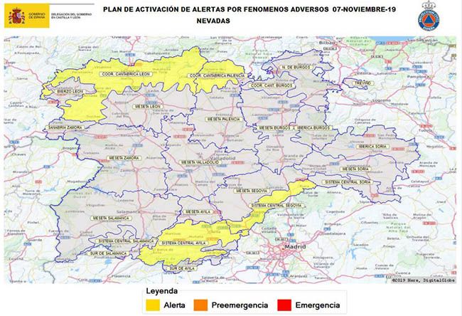 De igual forma, la alerta se ha activado en Segovia (Sistema Central) y Ávila (Sistema Central) desde las 18:00 horas  y en Palencia (Cordillera Cantábrica) desde las 23:00 horas de este jueves.