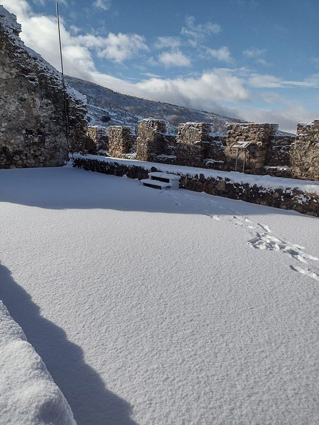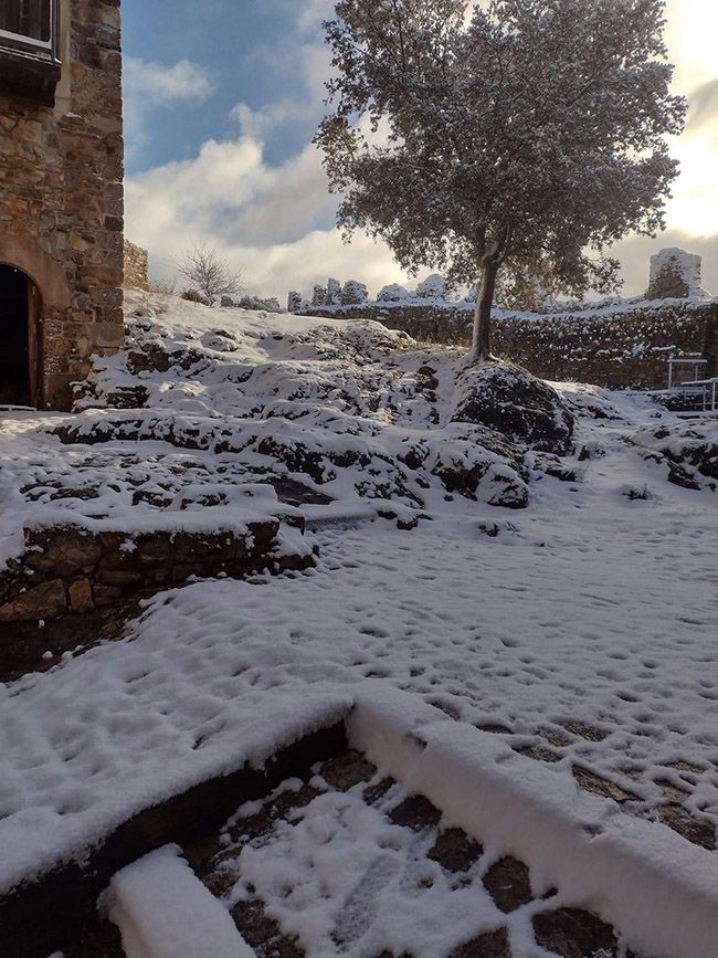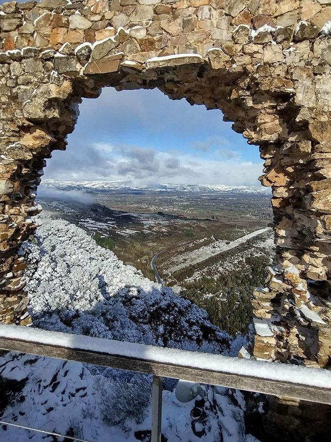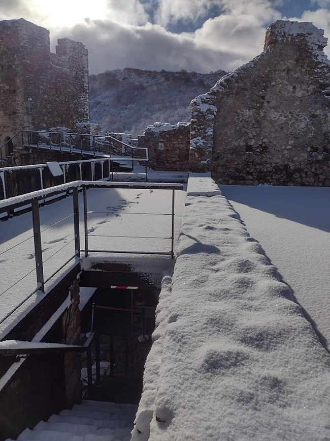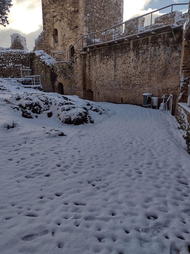 Desde lo alto del castillo las vistas muestran el paisaje nevado y dentro de él, dejan curiosas 'postales' como la de las escaleras de acceso nevadas, dándole un aspecto de cuento.