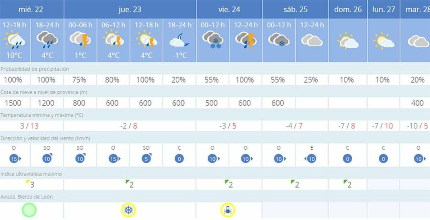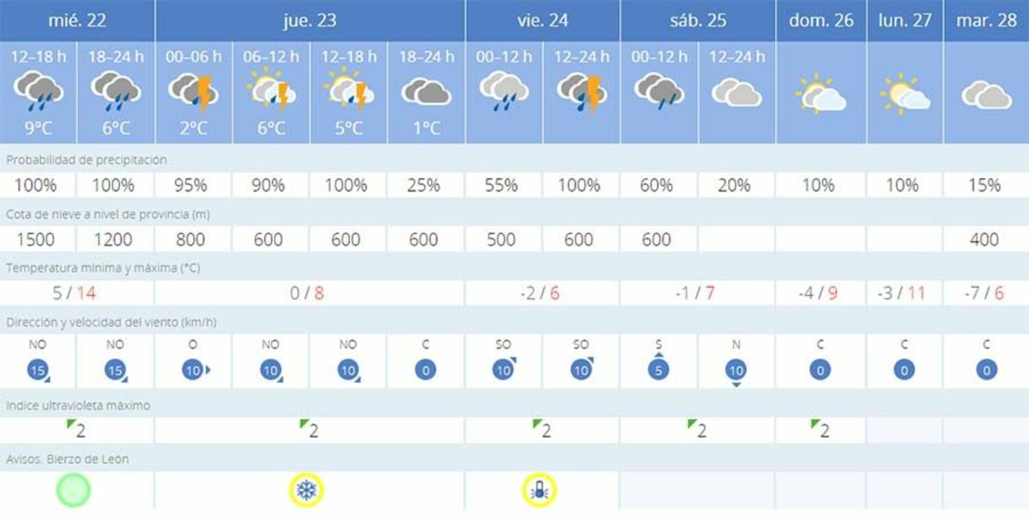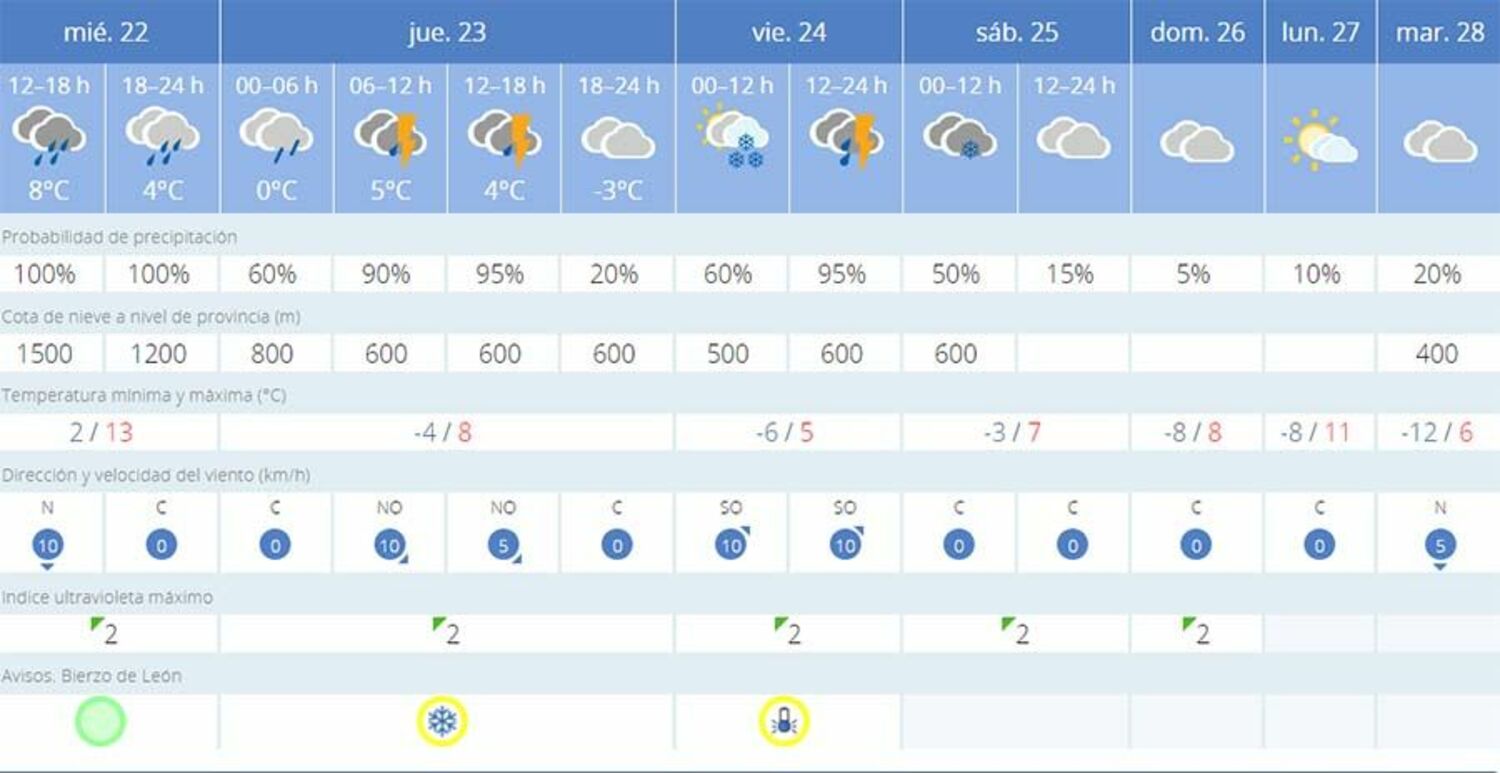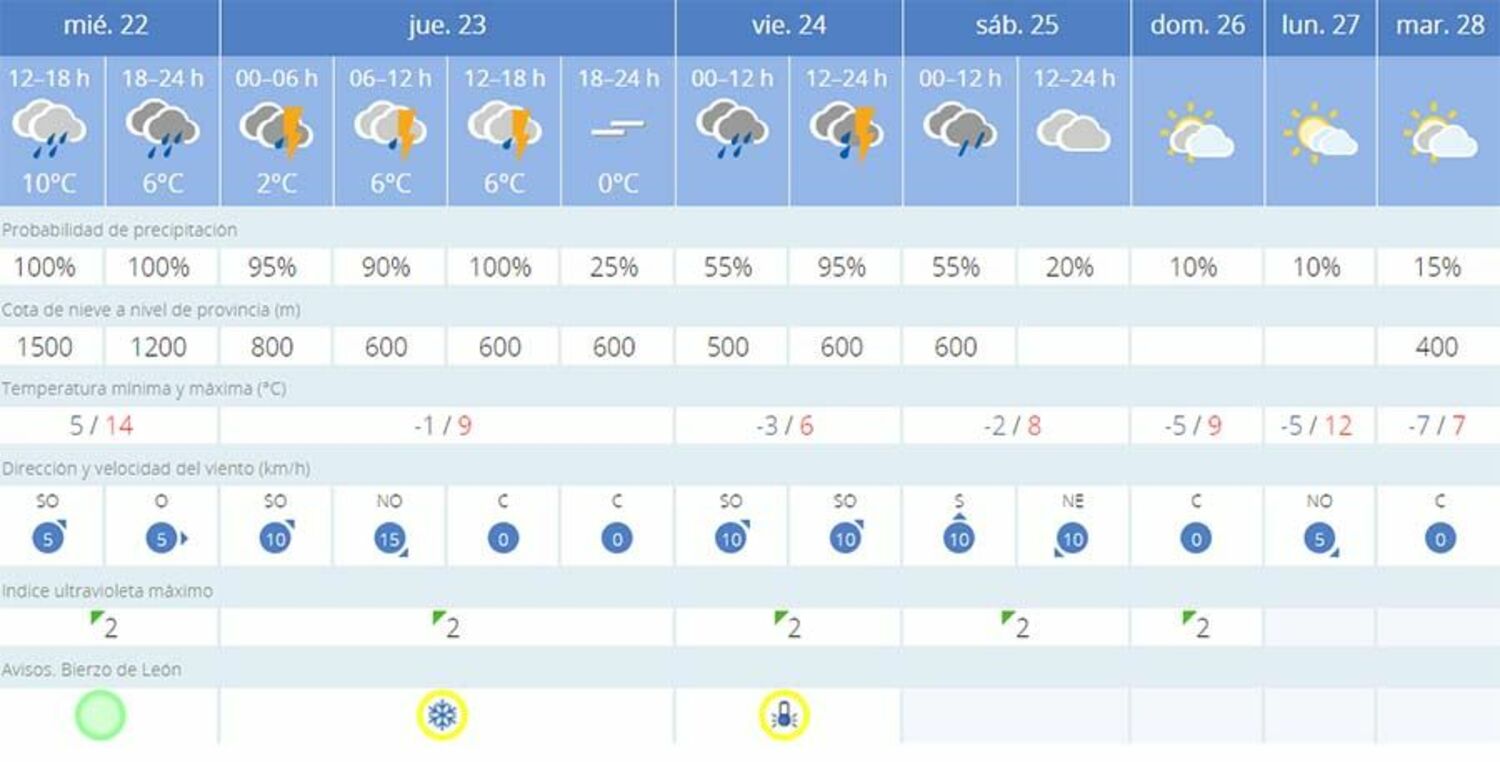 En la capital del Bierzo alto, la nieve también hará acto de presencia este viernes con una cota de nieve a 500 metros. Respecto a las temperaturas volverán a marcas cifras negativas pudiendo registrar mínimas de -3 grados. La AEMET también ha establecido aviso amarillo por nieve y bajas temperaturas para el jueves 23 de febrero y viernes, 24 de febrero.
