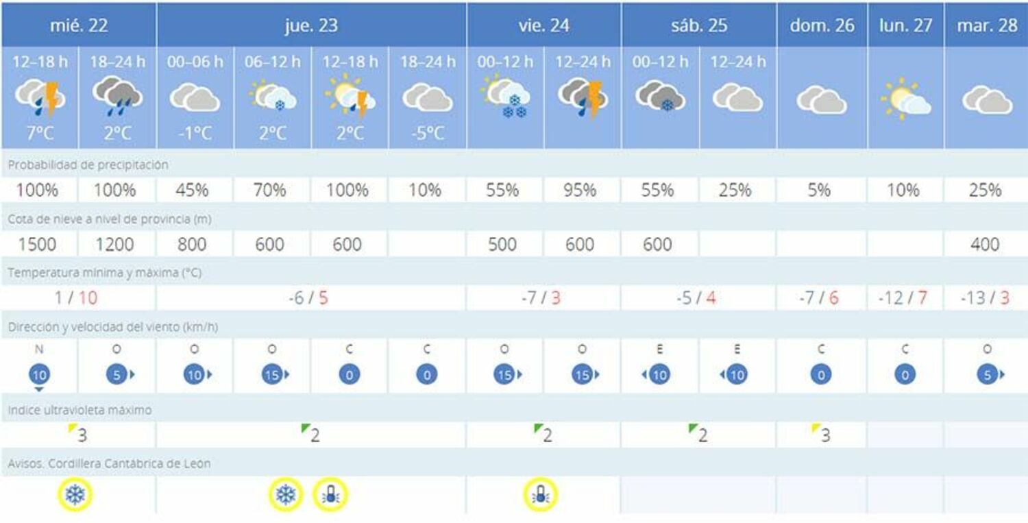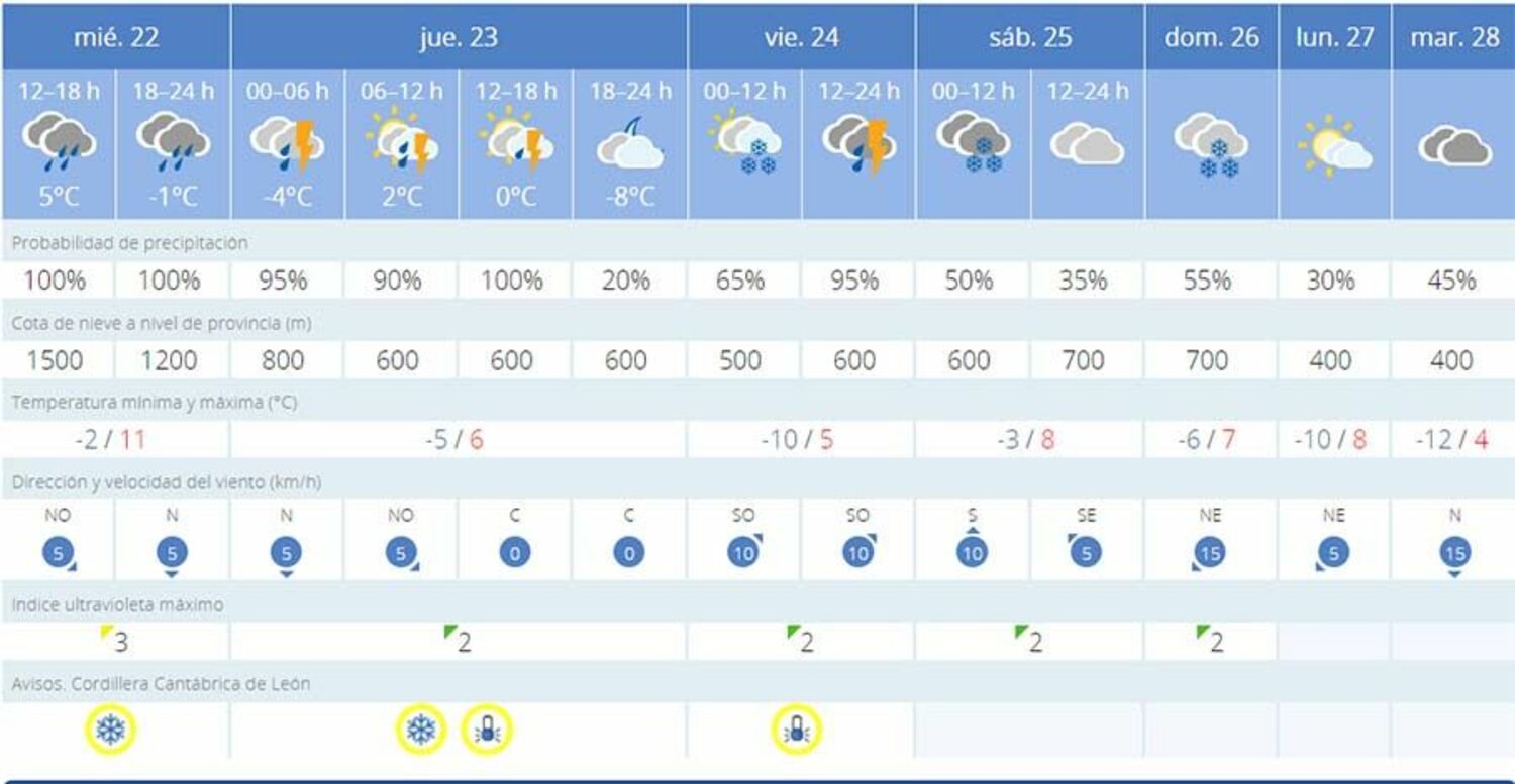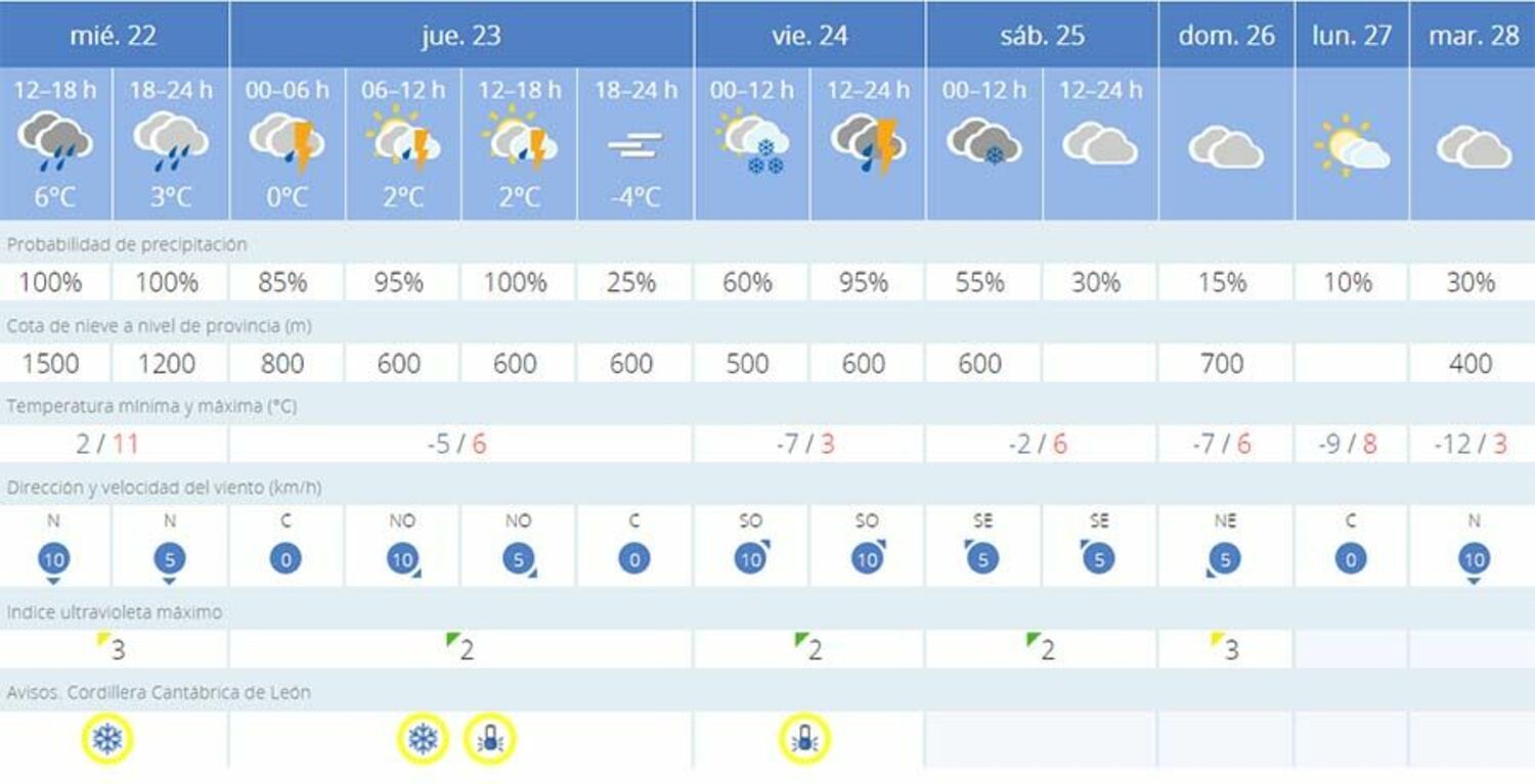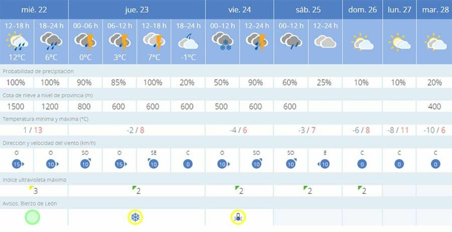 En la capital del Bierzo alto, la nieve también hará acto de presencia este viernes con una cota de nieve a 500 metros. Respecto a las temperaturas volverán a marcas cifras negativas pudiendo registrar mínimas de -3 grados. La AEMET también ha establecido aviso amarillo por nieve y bajas temperaturas para el jueves 23 de febrero y viernes, 24 de febrero.