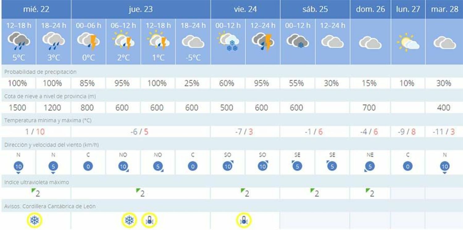 Los avisos amarillos por nieve y baja temperatura ya han sido activados por AEMET en Páramo del Sil, desde este miércoles, hasta el viernes, 24 de febrero. Respecto a las temperaturas, cifrarán marcas mínimas por debajo de los 0 grados. En lo que respecta a precipitaciones por nieve, se producirán el viernes y sábado.