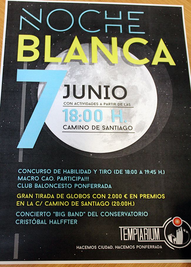 La Noche Blanca incluirá varias actividades, empezando por un concurso de habilidad y tiro y una exhibición del Club de Baloncesto Ciudad de Ponferrada. A las 20:00 se efectuará una tirada de 2.000 globos desde dos grúas, con 2.000 euros en premios para gastar durante la noche en los establecimientos de la Asociación Templarium. Estos premios se dividen en importes de 25 euros, 50 euros y 100 euros y podrán canjearse en los locales de la Asociación, que también tendrán "su fiesta privada, según el establecimiento" y "descuentos en sus productos desde el 20% al 50%", ha explicado Álvarez. Algunas tiendas podrán extender estos descuentos hasta el sábado, pero los premios de los globos solo podrán canjearse durante la noche del viernes. La Noche Blanca concluirá con un concierto de la "Big Band" del Conservatorio Cristóbal Halffter de Ponferrada.
