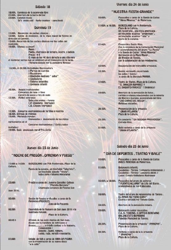 Las fiestas en Toreno arrancan ya desde el sábado, 5 días antes del día 23 y se extienden hasta el 25. El 23 es la 'Noche del pregón, ofrenda y fuego' y a las 00.30 horas tendrá lugar el encendido de la hoguera y la queimada, en la plaza de la Cultura. Antes, Pibierzo llenará el cielo de otra hoguera, la de los fuegos artificiales, en la zona de la pasarela. A las 00.45 horas se producirá la ofrenda de las siete plantas a la hoguera.