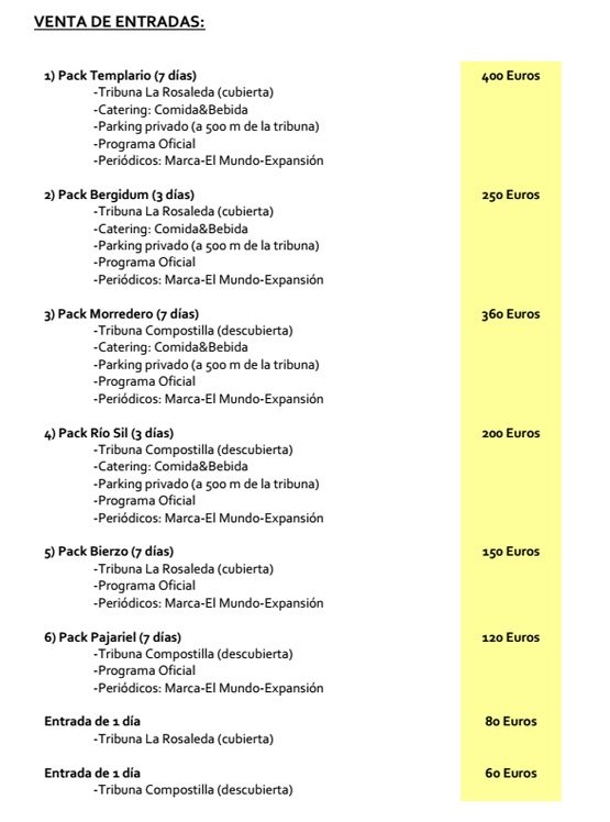 Para la ubicación en la zona de tribuna y meta, en diferentes packs. Pueden adquirirse a través de la web del Mundial. Los pack llevan nombres de enclaves bercianos: "Pajariel, Bierzo, Sil, Morredero, Bérgidum y Templario"