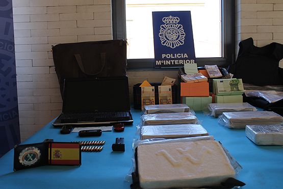 20151001_96 Material incautado en la vivienda del clan, entre los que se encuentran además de los 10 kilos de droga una placa falsa de Guardia Civil, cargadores y cartuchos, ordenadores portátiles y teléfonos móviles.