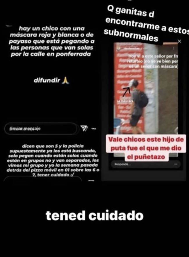 "Dicen que son 5 y la policía supuestamente ya los está buscando, sólo pegan cuando están solos, cuando van en grupos no y van separados; Los vimos mi grupo y yo la semana pasada detrás de pizza móvil sobre las 6", asegura un usuario de Instagram.