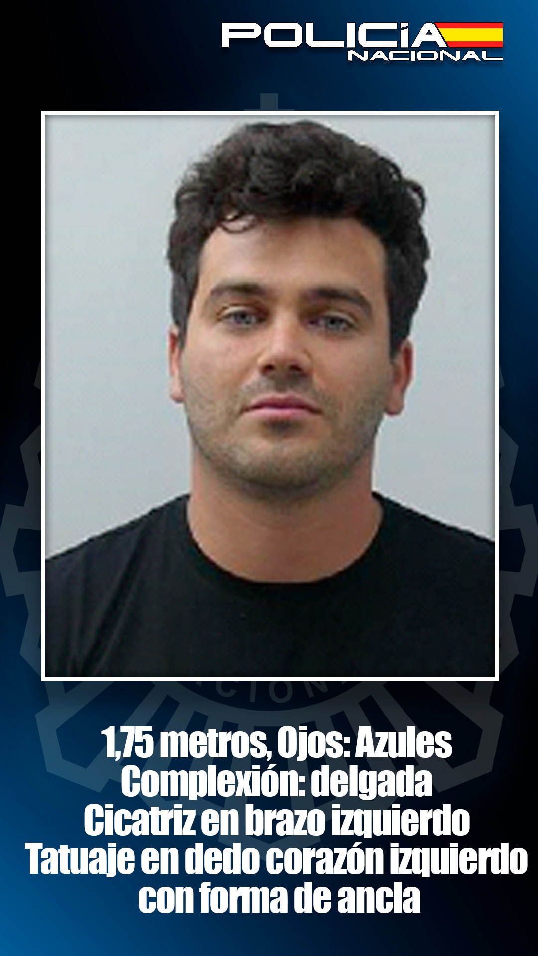 La Policía Nacional ha compartido a través de su cuenta de Twitter el rostro de Manuel Herrero Muñoz, un hombre español de 33 años que se encuentra en búsqueda y captura por homicidio, al que el cuerpo de la Policía Nacional lo caracteriza de "agresivo y peligroso" con "ojos azules claros", además posee una cicatriz en el brazo izquierdo y un tatuaje en dedo corazón izquierdo con forma de ancla.