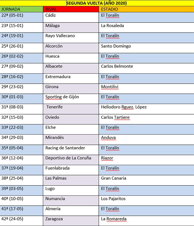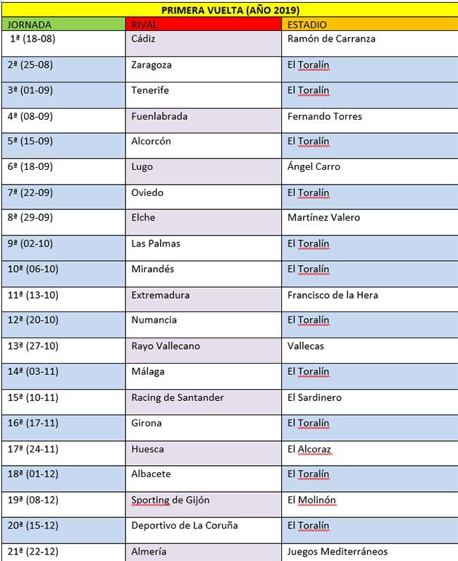 La Liga 123 acabará el 24 de mayo con la 42ª jornada, en la que el conjunto de la capital berciana se enfrentará al Zaragoza en el estadio La Romareda de la capital aragonesa. Pese a que el calendario es asimétrico, la Deportiva recibirá al Cádiz en El Toralín en la primera jornada de la segunda vuelta, el 5 de enero de 2020, que será cuando se reanude la competición tras el parón navideño. Despedirá el 2019 en Almería, en el estadio de los Juegos Mediterráneos, donde disputará la 21ª jornada.