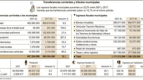 El informe también revela las transferencias corrientes recibidas por los municipios de Castilla y León desde las diferentes instancias, que ascendieron en el año 2017, a 680,55 millones de euros, que representan un aumento del 12,1 por ciento, la mitad del crecimiento experimentado por la recaudación de impuestos.