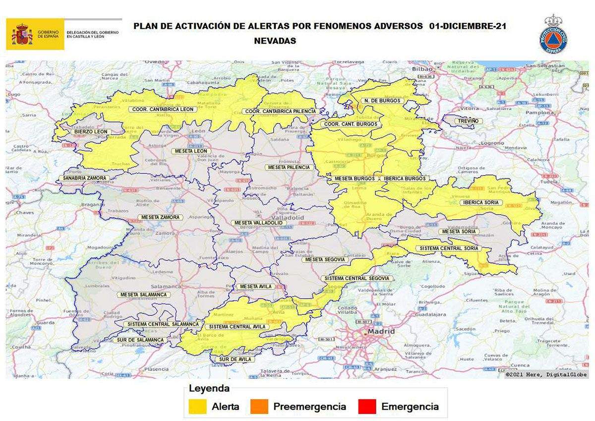 La Agencia Estatal de Meteorología (AEMET) ha activado para mañana alerta por nevada en las provincias de León, Palencia, Burgos, Soria, Ávila y Segovia. Así, una vez que se han llevado a cabo las revisiones de AEMET para este miércoles y para el jueves 2 de diciembre, se ha llevado a cabo la activación de la Fase de Alerta en diferentes puntos de la Comunidad desde las 00:00 horas de mañana 2 de diciembre. Sin embargo, Protección Civil de Castilla y León espera que este fenómeno meteorológico "sea breve".
