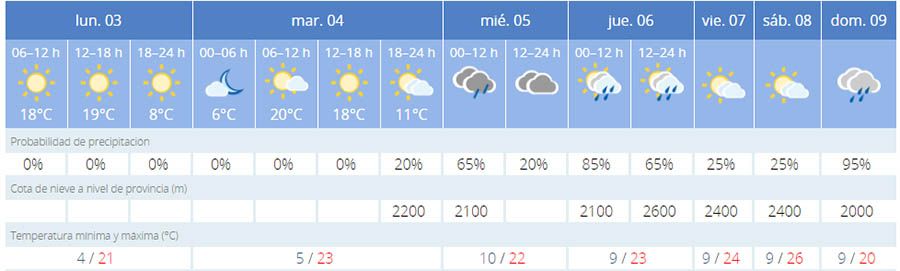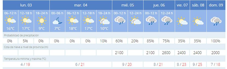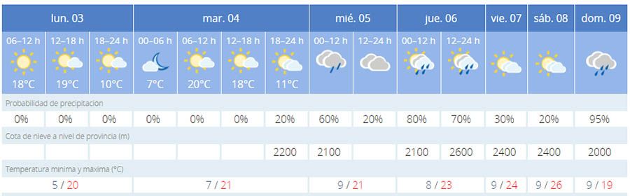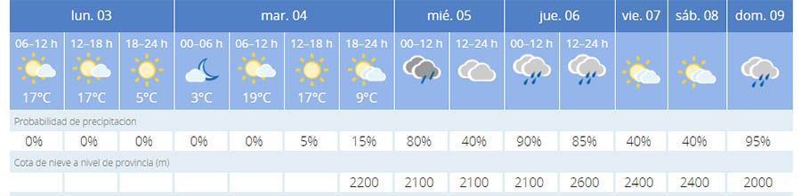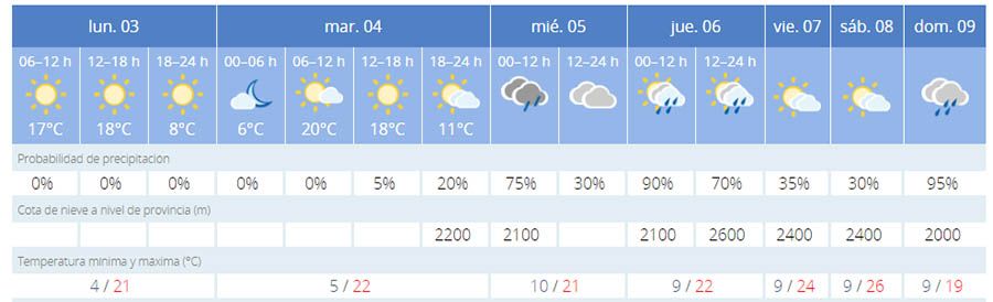 En cuanto a los cielos, predominarán los días despejados y de sol, aunque el miércoles, jueves y domingo la probabilidad de lluvia oscila entre el 60% y el 95% en función de las franjas horarias y las zonas de la comarca.