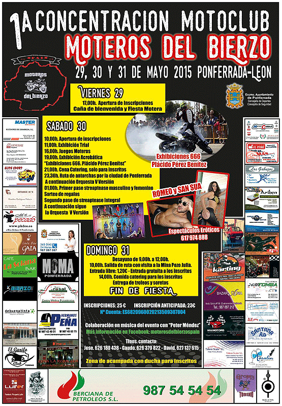 Los participantes esperan un número cercano a las 400 inscripciones para esta concentración, que se espera que sea una de muchas en Ponferrada, para convertir la ciudad en un referente para los aficionados a las motos. A las ya conocidas actividades como exhibiciones acrobáticas y de trial o juegos moteros se le sumarán otras de última hora. En concreto, este viernes a las 18.00 horas se celebrarán carreras de minimotos en tres categorías y de Pit Bikers Supermotard. Una hora más tarde habrá una degustación de jamón ibérico a cargo del cortador profesional Roberto González. Otro de los momentos importantes de la cita será la visita al Pozo Julia, el domingo a las 10.00 horas.