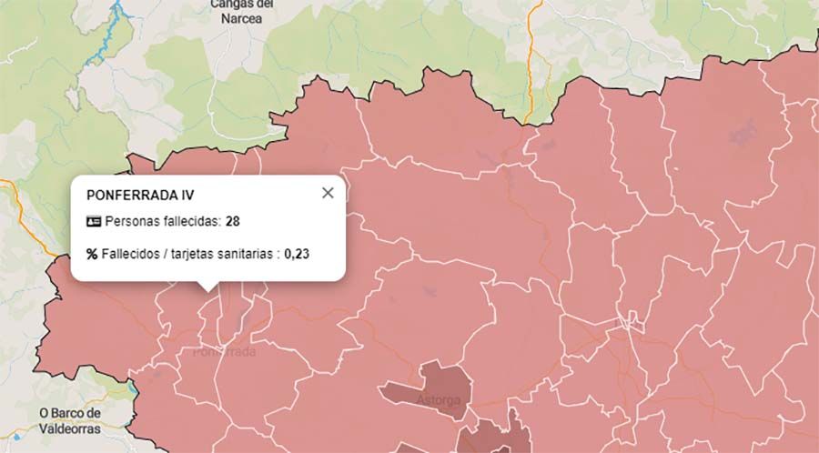 Mapa de Mortalidad por COVID19 / Junta CyLEl Bierzo y Laciana han sumado un fallecido más por Coronavirus en la última semana en la zona básica sanitaria de Ponferrada IV, según el informe de la Junta ofrecido este viernes. Los fallecidos por COVID-19 en ambas Comarcas ascienden así a 113 desde el inicio de la pandemia, 72 de ellos en el Hospital El Bierzo. Por zonas, Ponferrada registra 43 (Ponferrada I, 6; Ponferrada II, 12; Ponferrada III, 7; y Ponferrada IV, 28); Bembibre 16 fallecidos; Cacabelos 10; Villafranca 5, Puente 3; Toreno 3; Fabero 9 y Villablino 14.