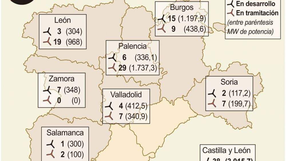 Mientras, la inmensa mayoría de los futuros parques eólicos de Castilla y León se centran en el norte de la comunidad, puesto que Burgos, León y Palencia acumulan casi dos tercios de los proyectos sometidos ya a información pública y el 78 por ciento de los parques en tramitación.