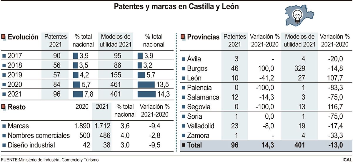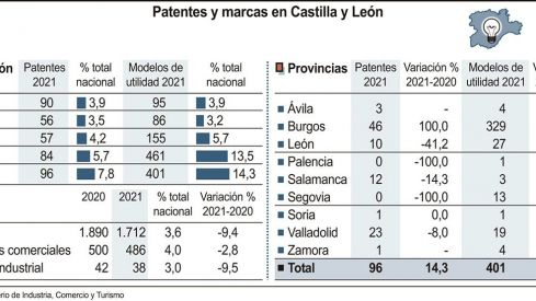 En cuanto a los modelos de utilidad, la provincia burgalesa también encabeza el ranking, con 329 en 2021, es decir, asumió el 82 por ciento del total de la Comunidad. Muy de lejos se situó León, con 27, Valladolid, con 19, y Segovia, con 13. Cuatro modelos de utilidad se produjeron en Ávila y Zamora, en ambos casos, en Salamanca, tres, y en Palencia y Soria, uno en cada una.