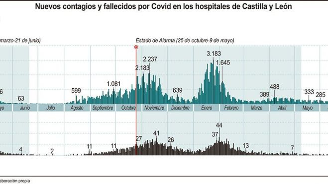 Ocho personas fallecieron en las últimas 24 horas por COVID-19 en hospitales de Castilla y León en las provincias de León, con tres casos; Burgos, dos, y Palencia, Segovia Valladolid, con uno. El número de decesos desde el inicio de la pandemia asciende ya a 5.970, según los datos anotados por la Consejería de Sanidad recogidos por la Agencia Ical. Desde el pasado lunes se produjeron 282 contagios en la Comunidad, un 54 por ciento menos que hace una semana y un número muy similar a los contabilizados ayer lunes (285).